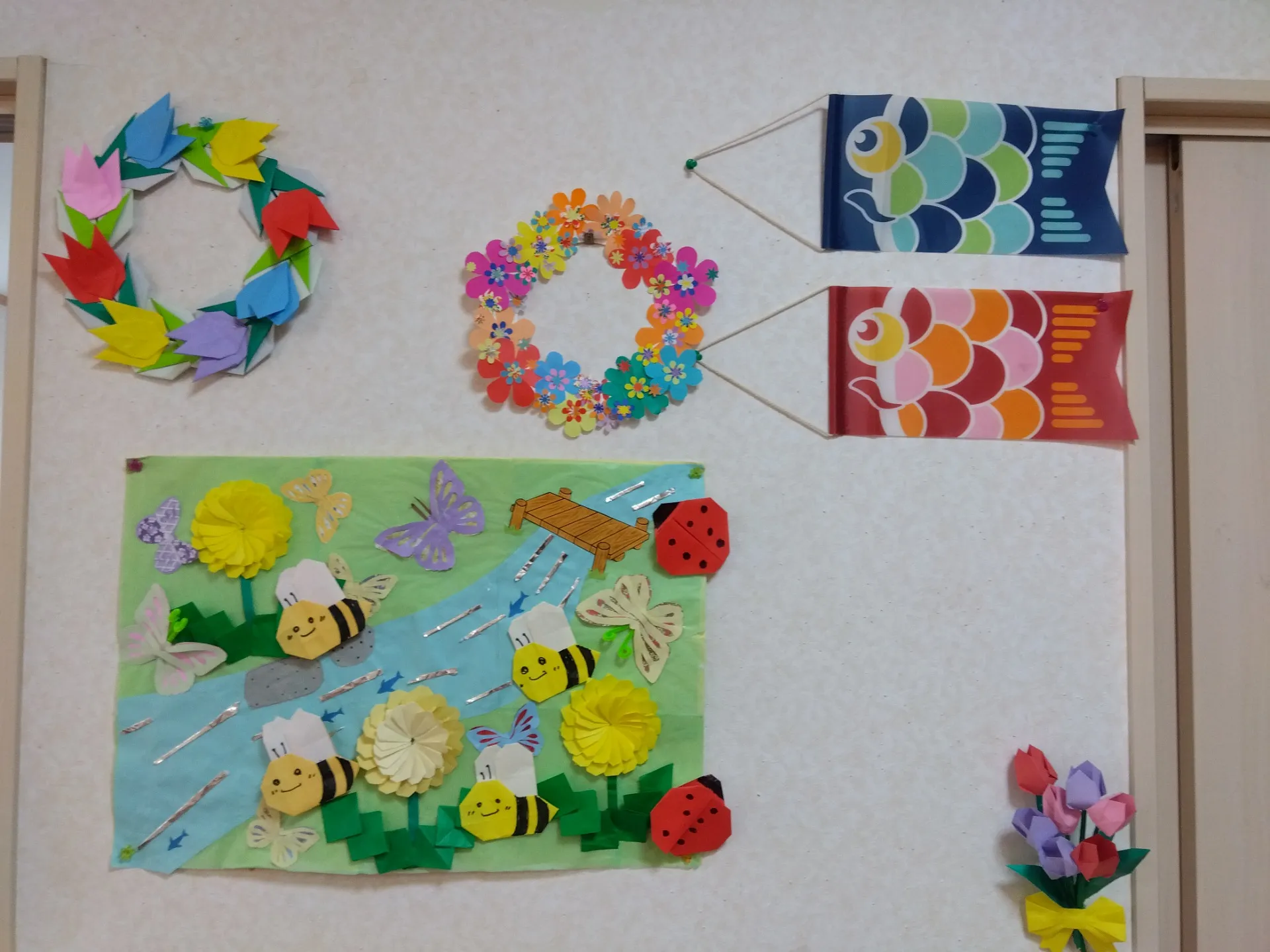 今回は、ちぎり絵や折り紙を使い、こいのぼりやお花をテーマにした作品づくりに取り組みました。